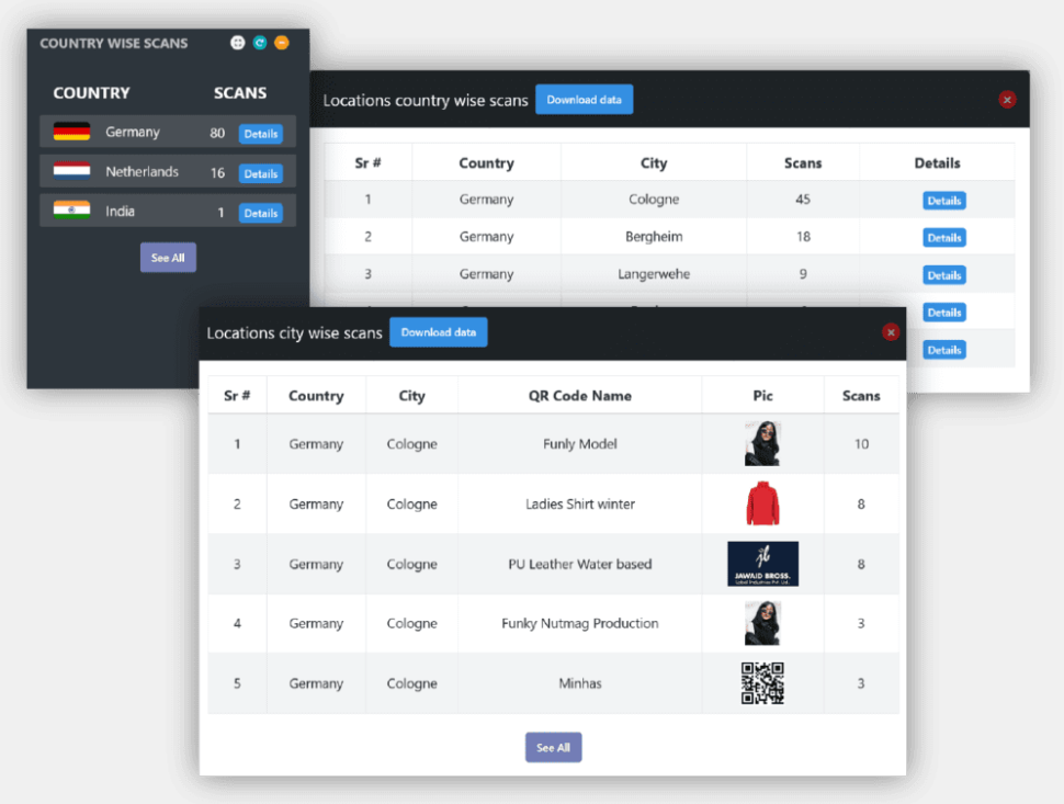 Her bir oluşturulan dinamik QR Kod için, dünya genelinde ülke ve şehir bazında tam tarama detaylarını edinin.