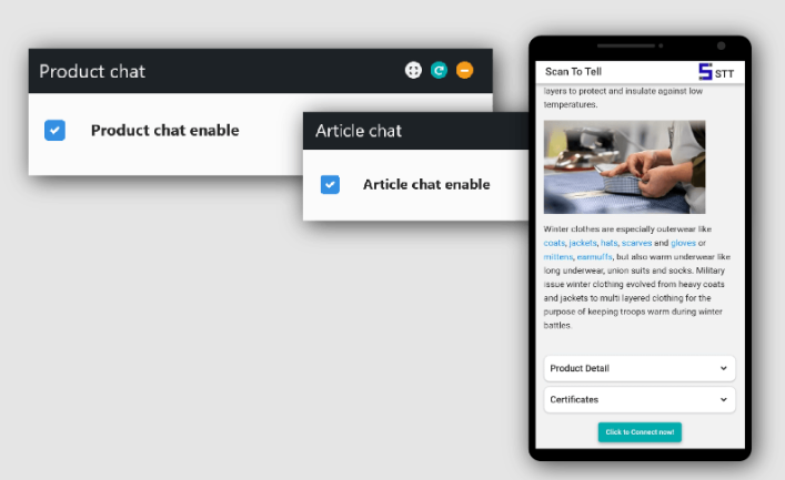 Müşterilerinizin taradıkları aynı QR Kodunda belirli bir ürünle ilgili olarak sizinle bağlantı kurabilmeleri için, Makale/Ürün veri yükleme portalında “Makale/Ürün sohbetini etkinleştir” seçeneğini işaretlemeniz gerekiyor.